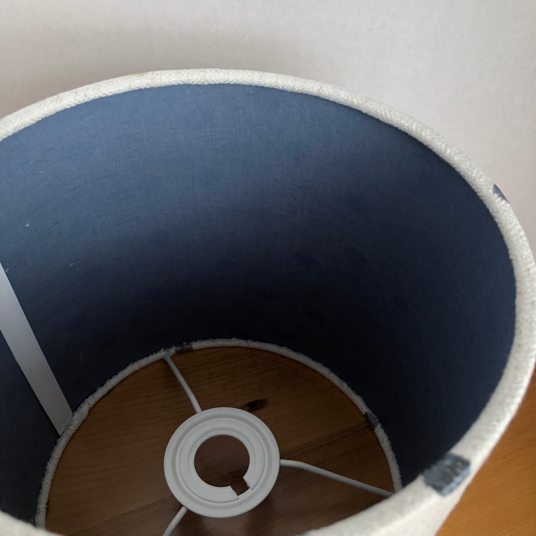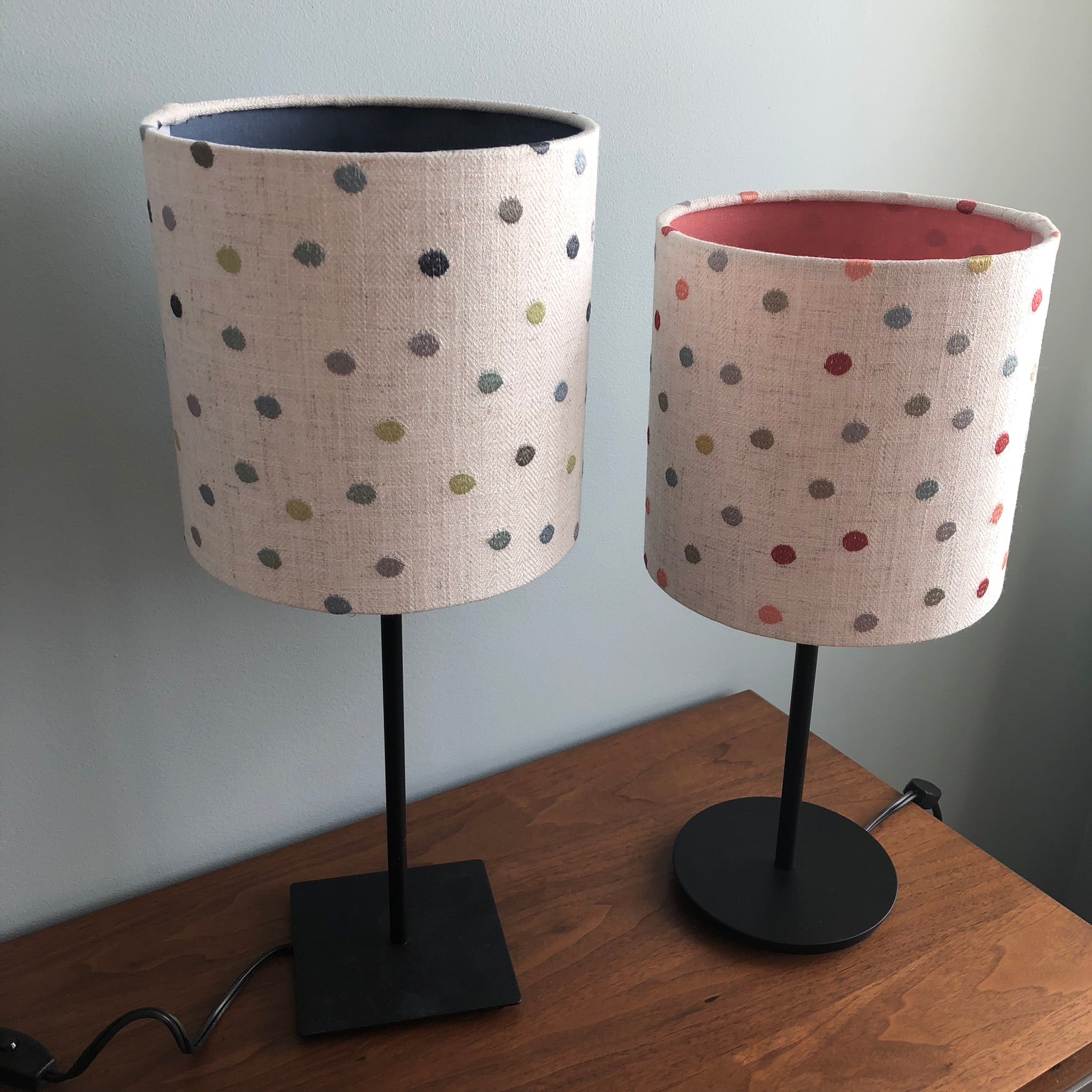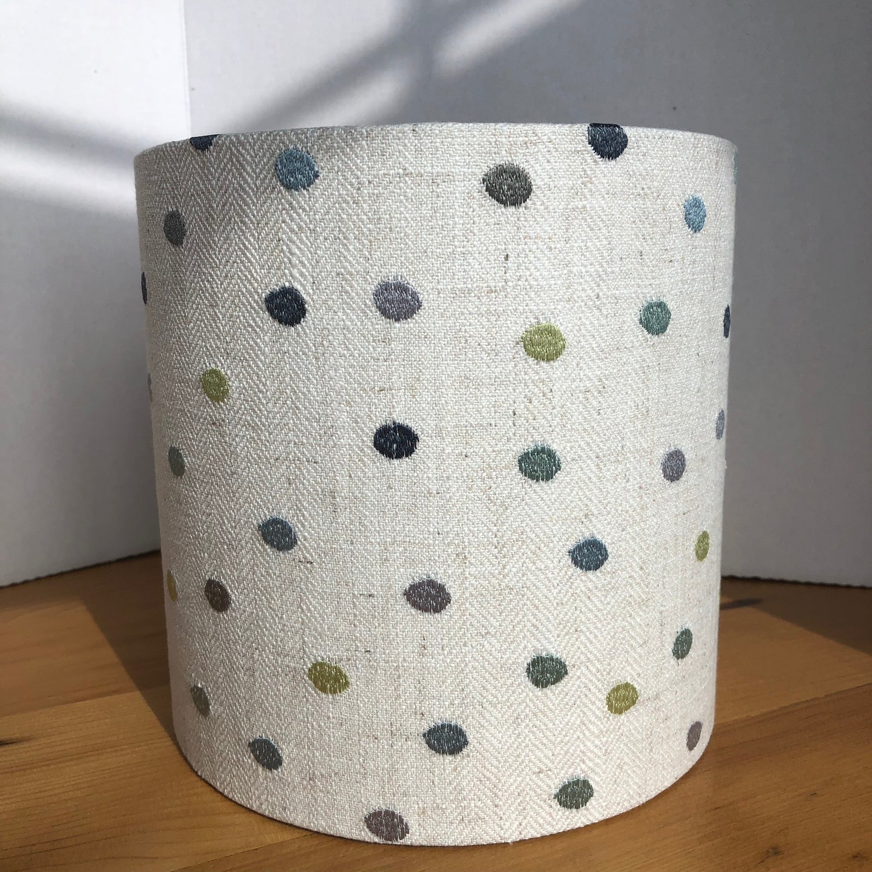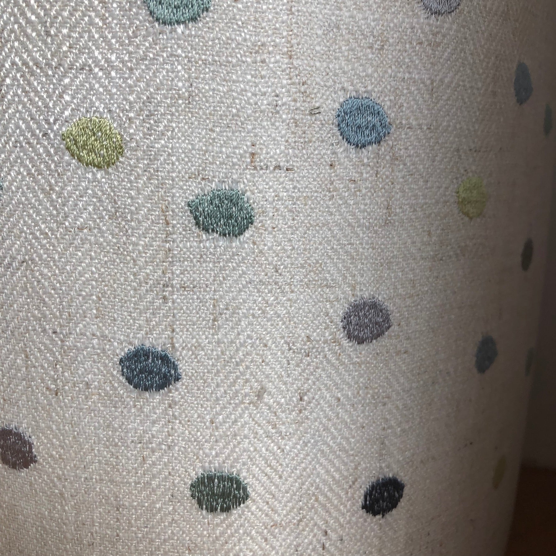 This fabric is a light off-white linen. The polka dots are embroidered in various shades of blue and green. The inside is lined with a blue linen emitting a softer glow from the top and bottom of the light. The lamp is also available in a white lining, PVC, emitting a brighter glow.