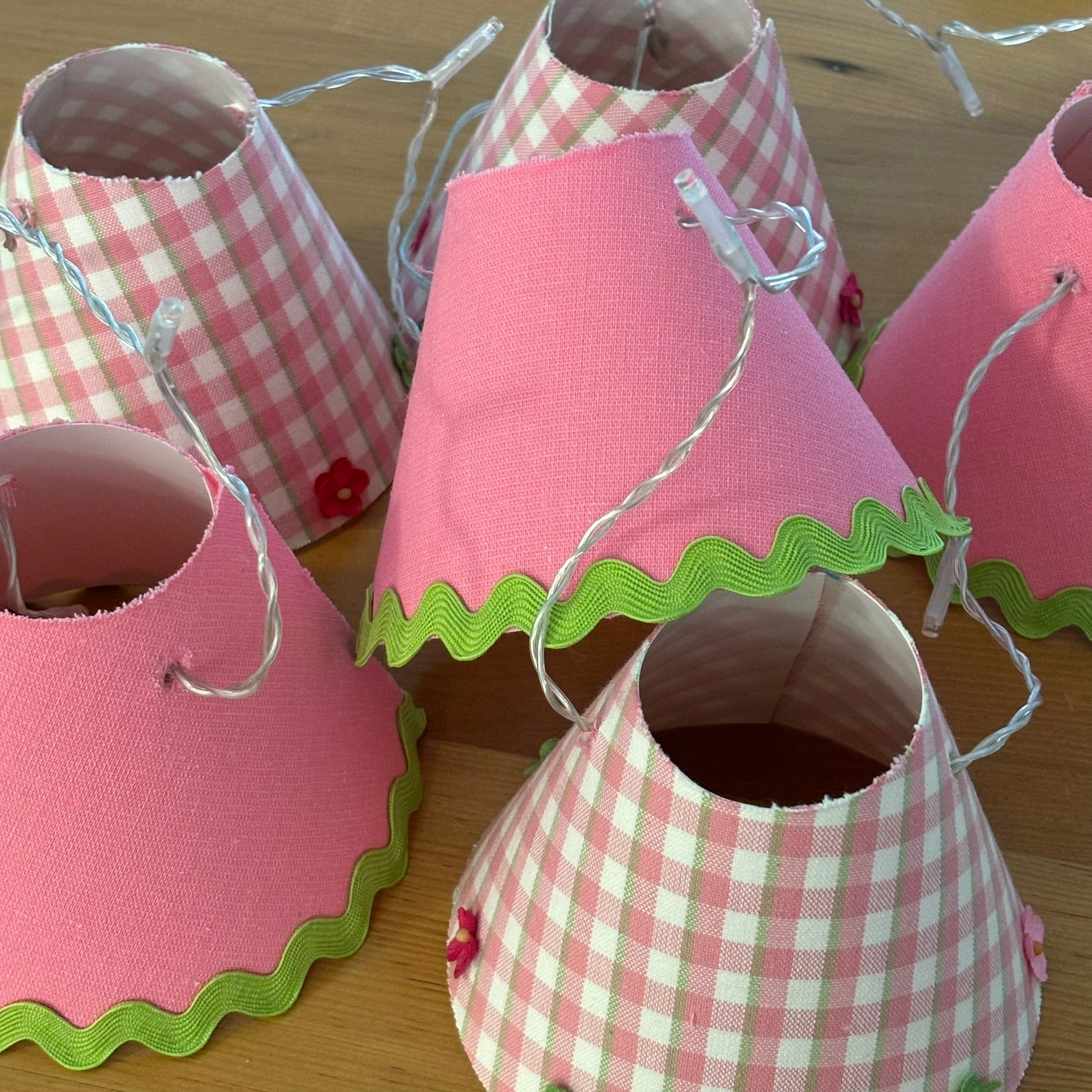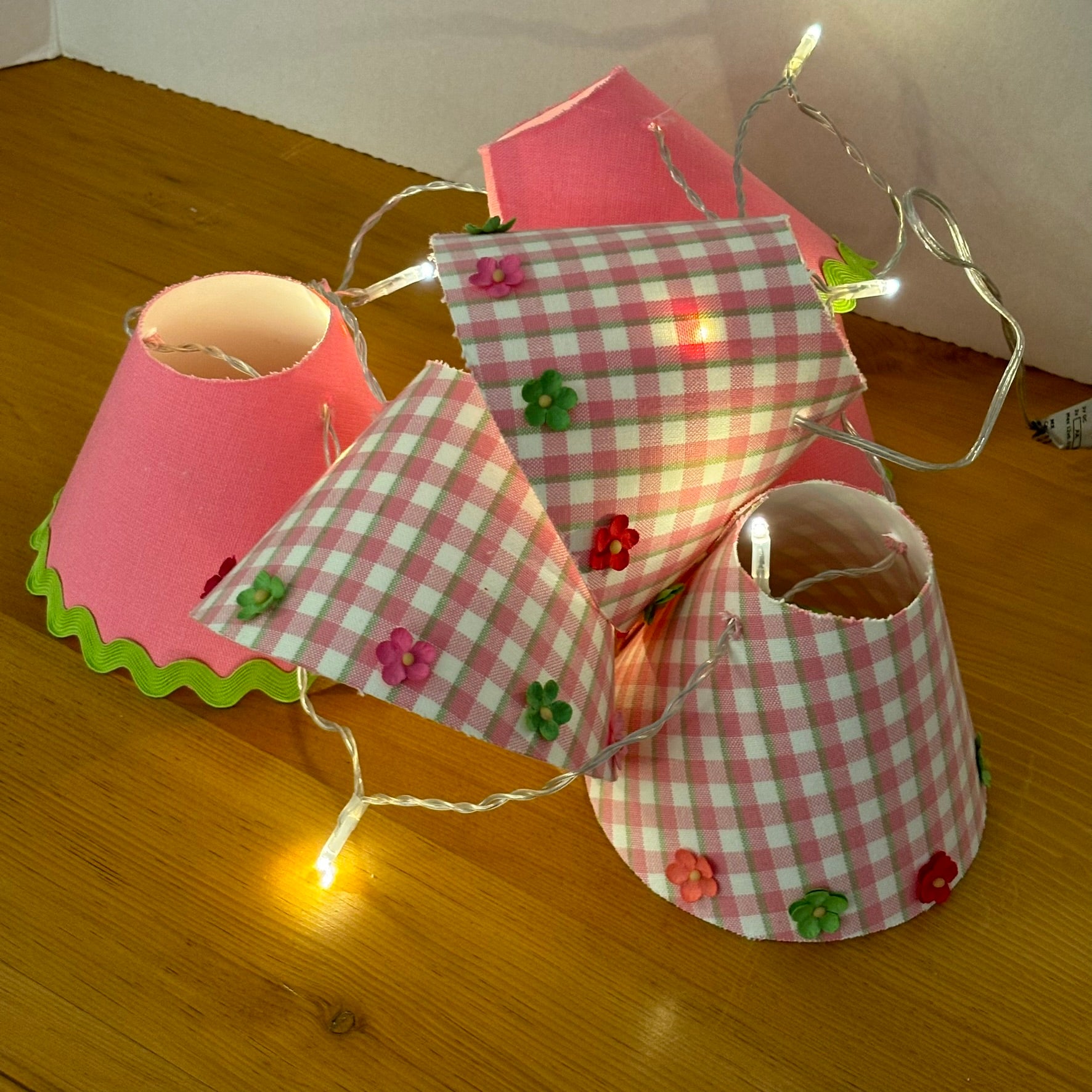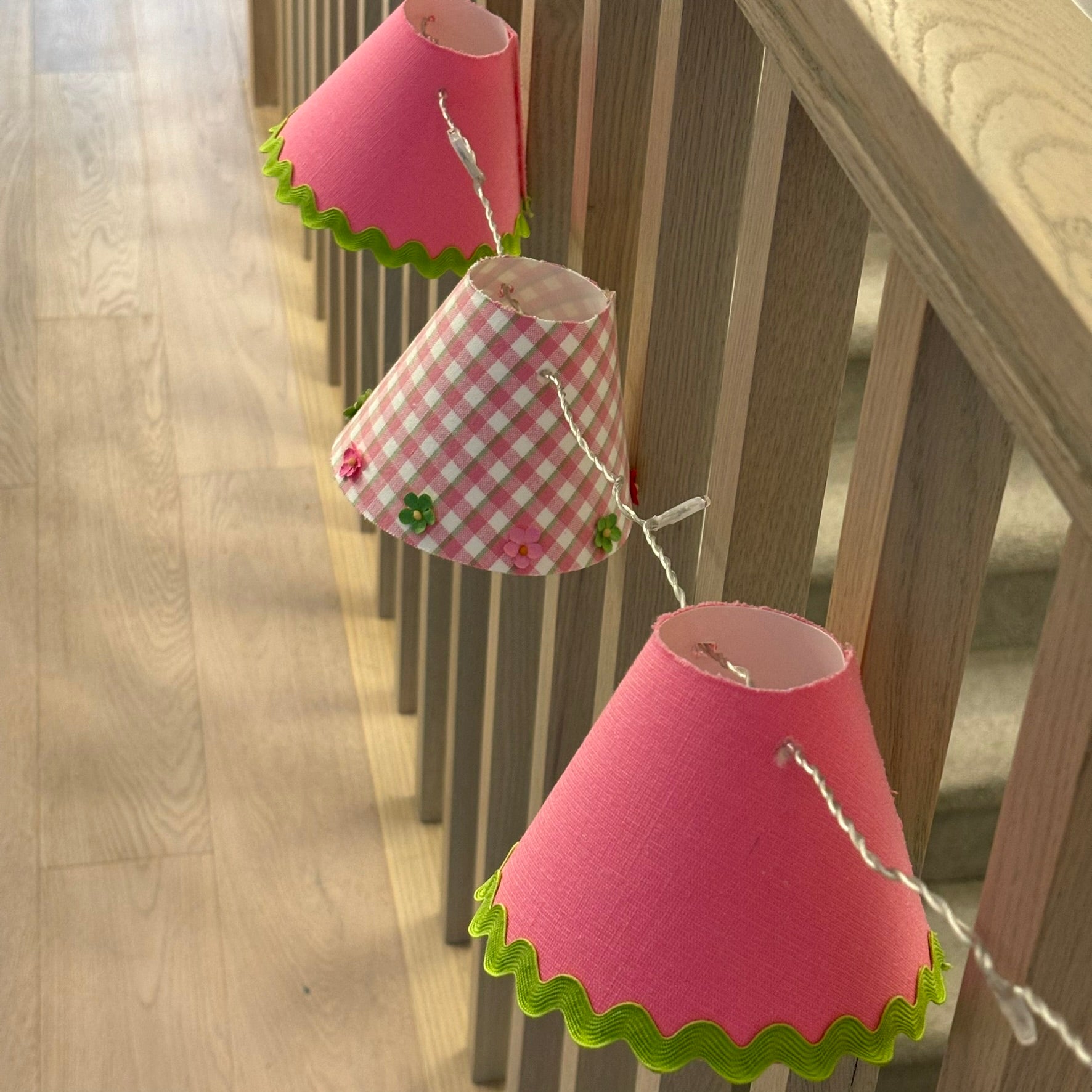 Add a whimsical touch to your inside and outside decor. We have created two styles of mini lampshades on a 6',11' string of fairy lights. Every second light is decorated with a cone or drum shaped lampshade covered in fun fabrics and trims. The string is battery operated. Easy to drape across a staircase or simply hang from a doorway/window opening. Great in a child's room as a decoration or to act as a night light. Can be used outside if covered or removed before rain. Picture in a gazebo or strung along a fence.