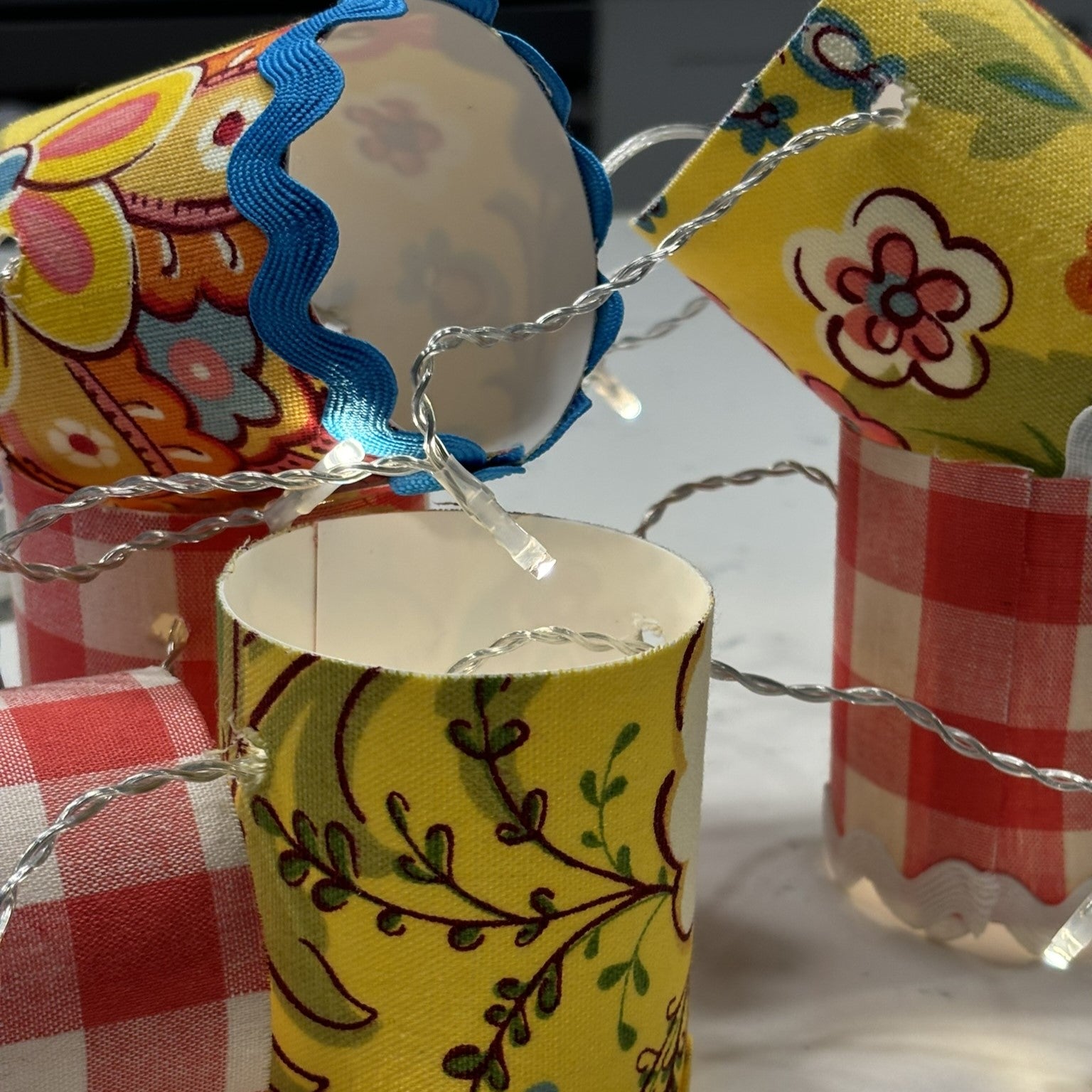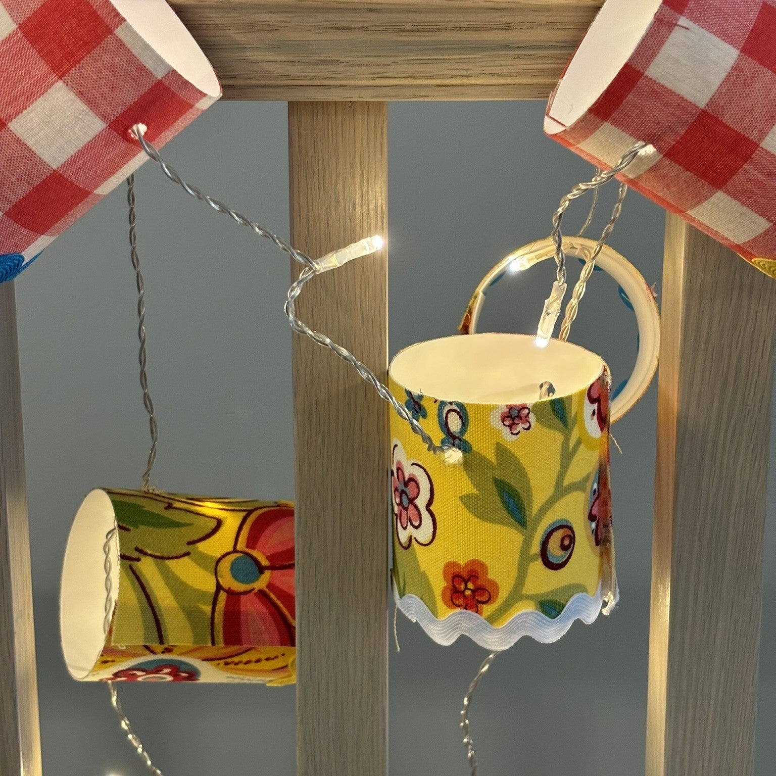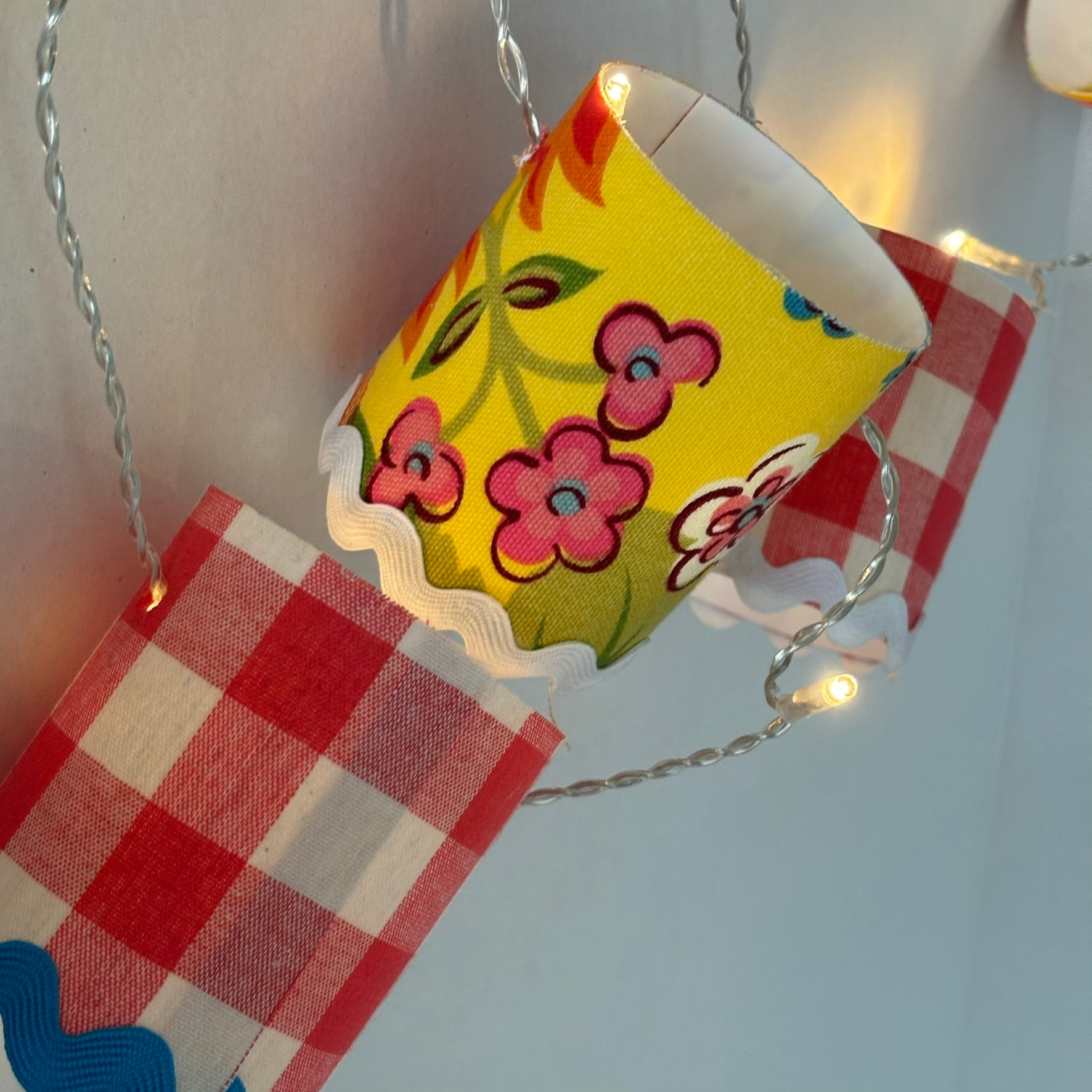 Add a whimsical touch to your inside and outside decor. We have created two styles of mini lampshades on a 6',11' string of fairy lights. Every second light is decorated with a cone or drum shaped lampshade covered in fun fabrics and trims. The string is battery operated. Easy to drape across a staircase or simply hang from a doorway/window opening. Great in a child's room as a decoration or to act as a night light. Can be used outside if covered or removed before rain. Picture in a gazebo or strung along a fence.