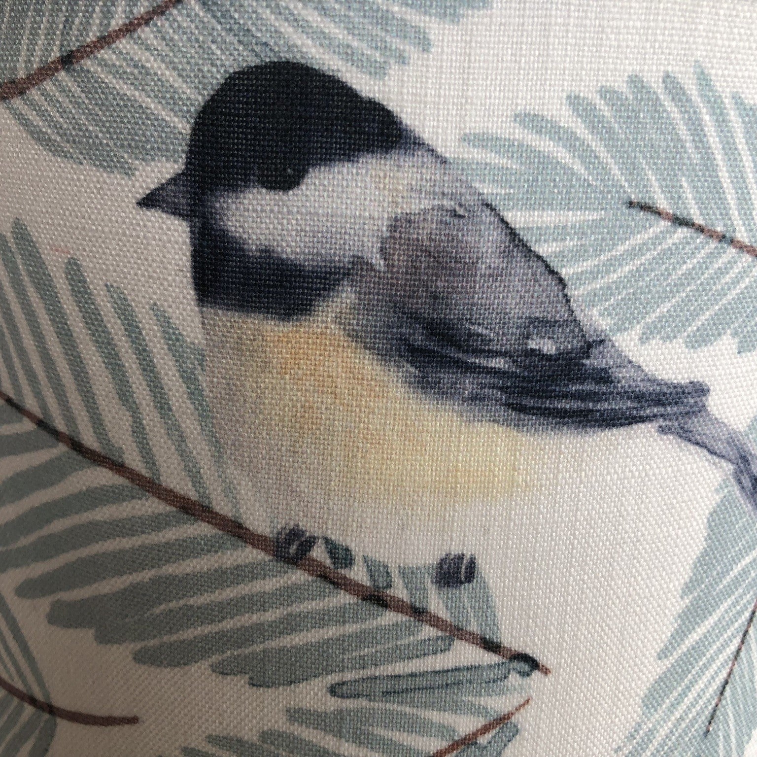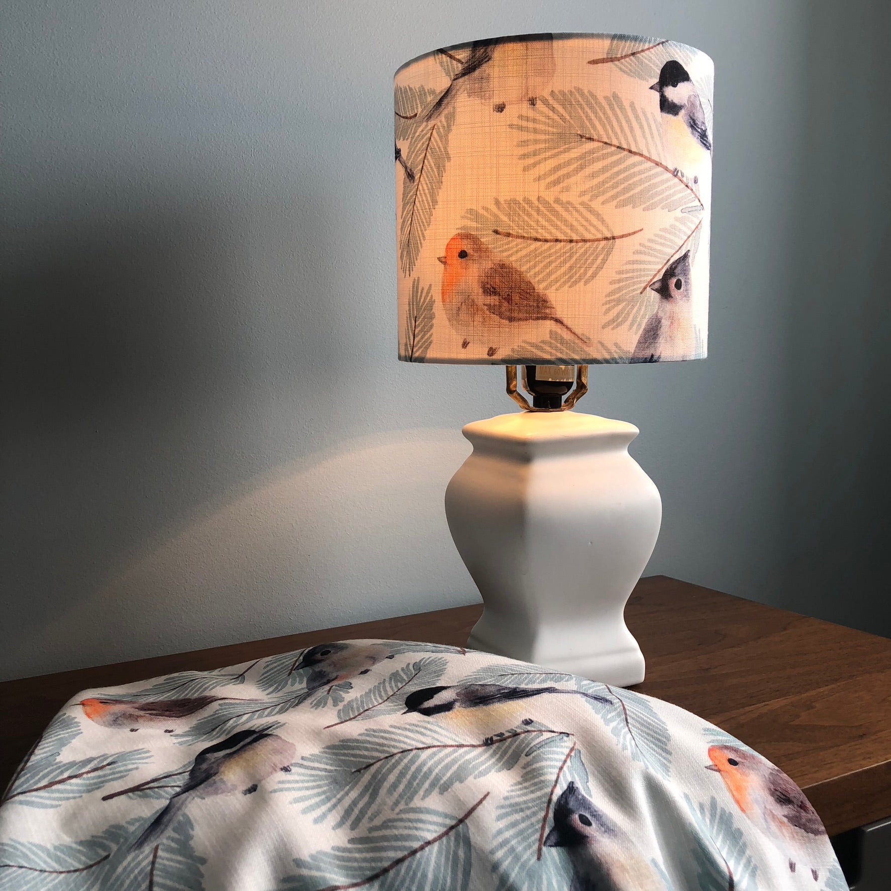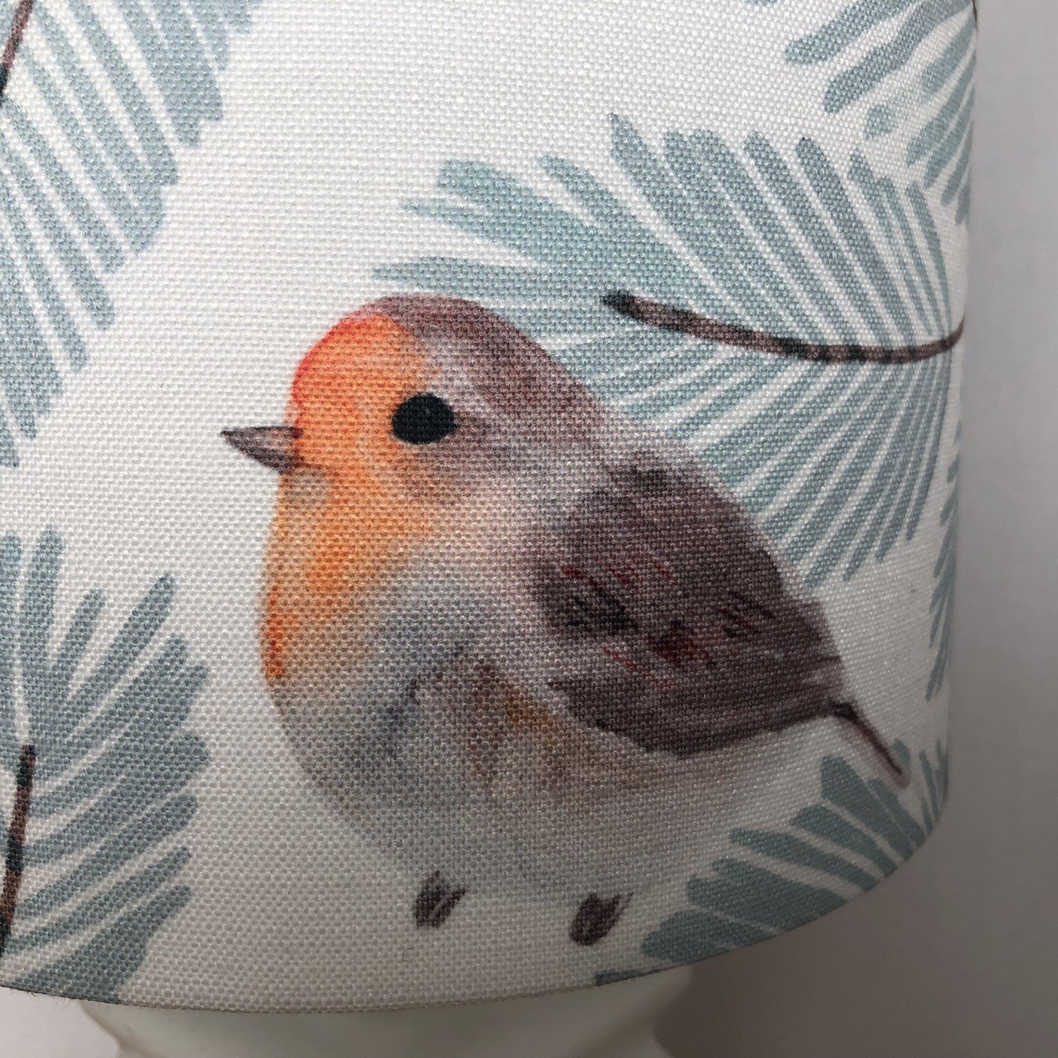 This fabric is a light off-white linen. The polka dots are embroidered in various shades of blue and green. The inside is lined with a blue linen emitting a softer glow from the top and bottom of the light. The lamp is also available in a white lining, PVC, emitting a brighter glow.