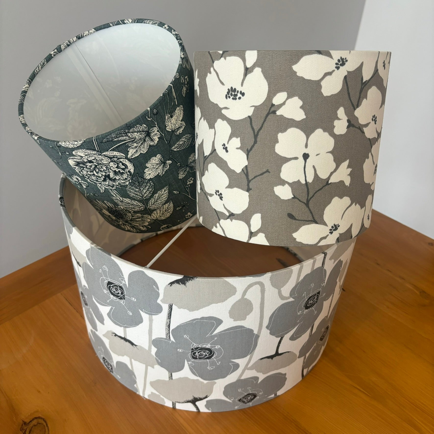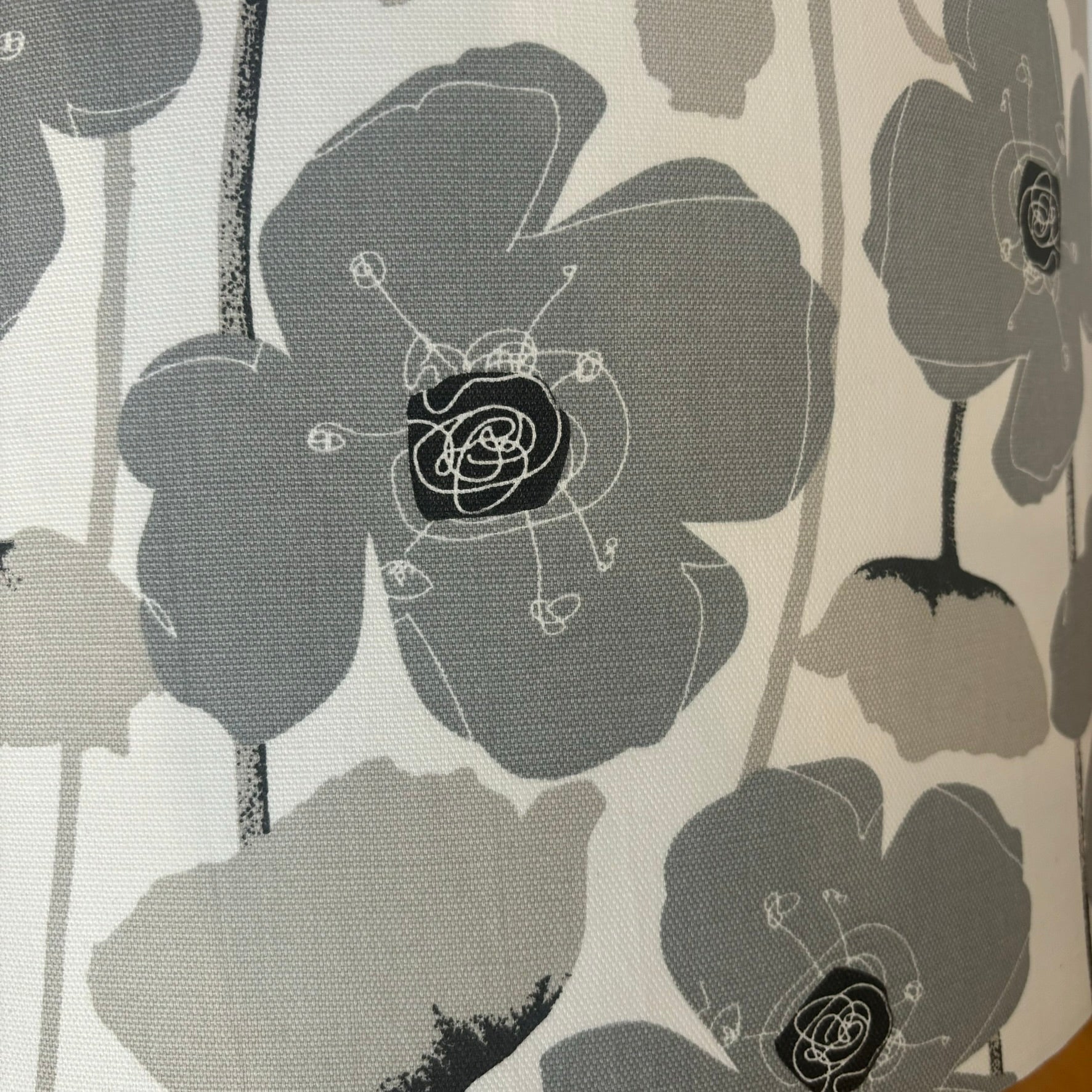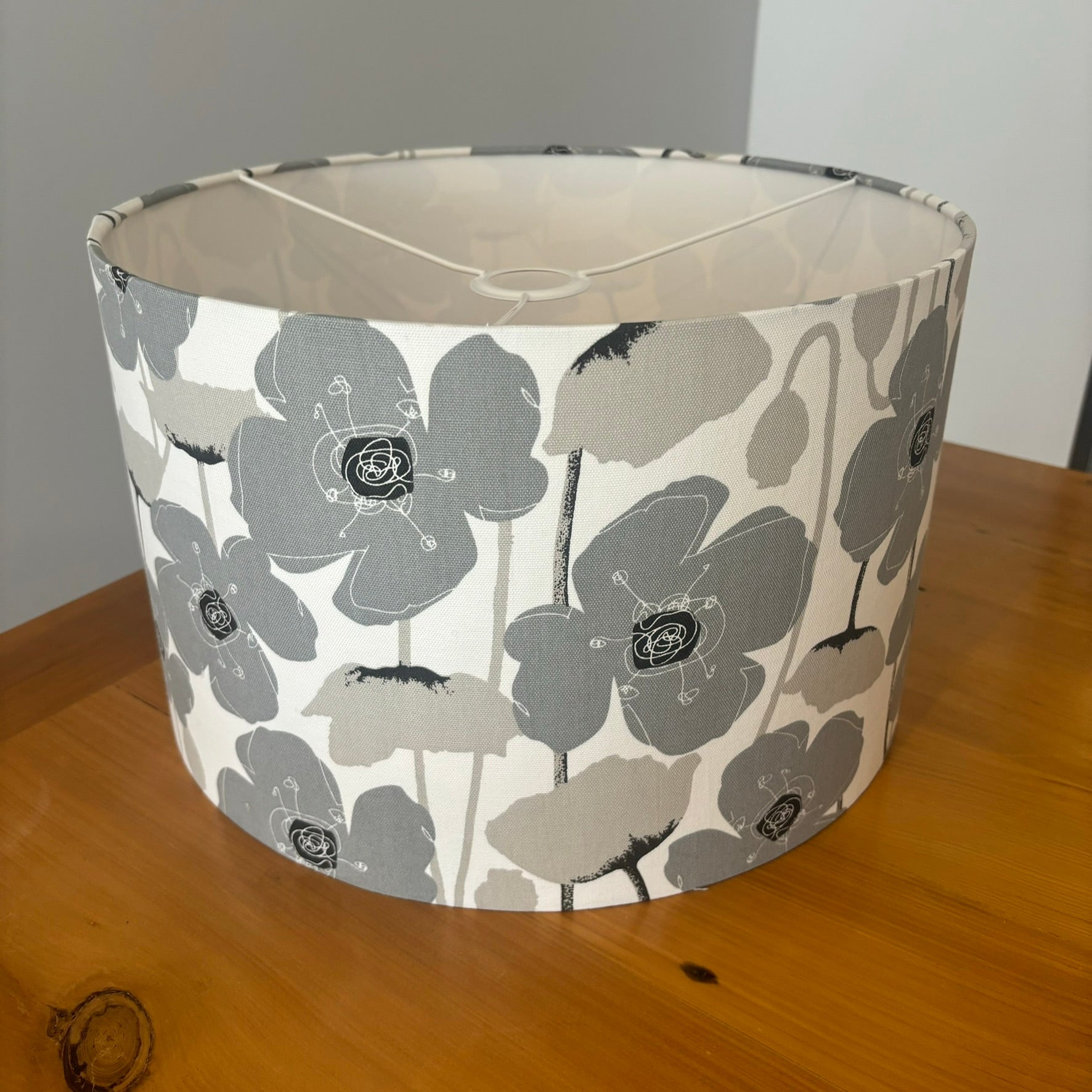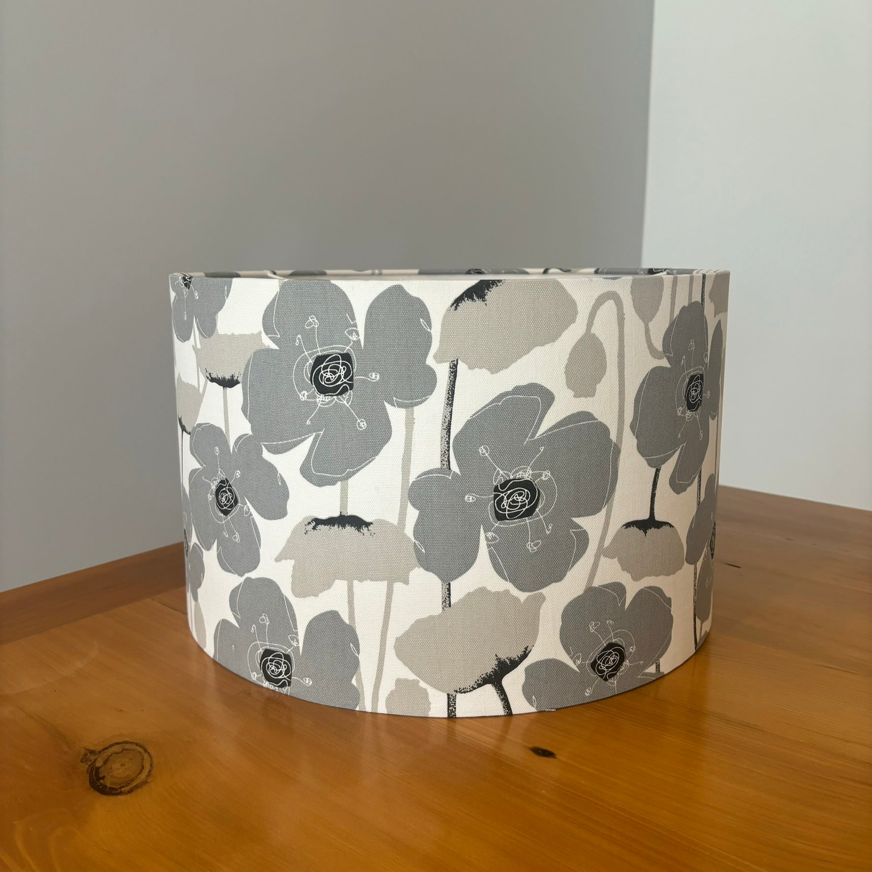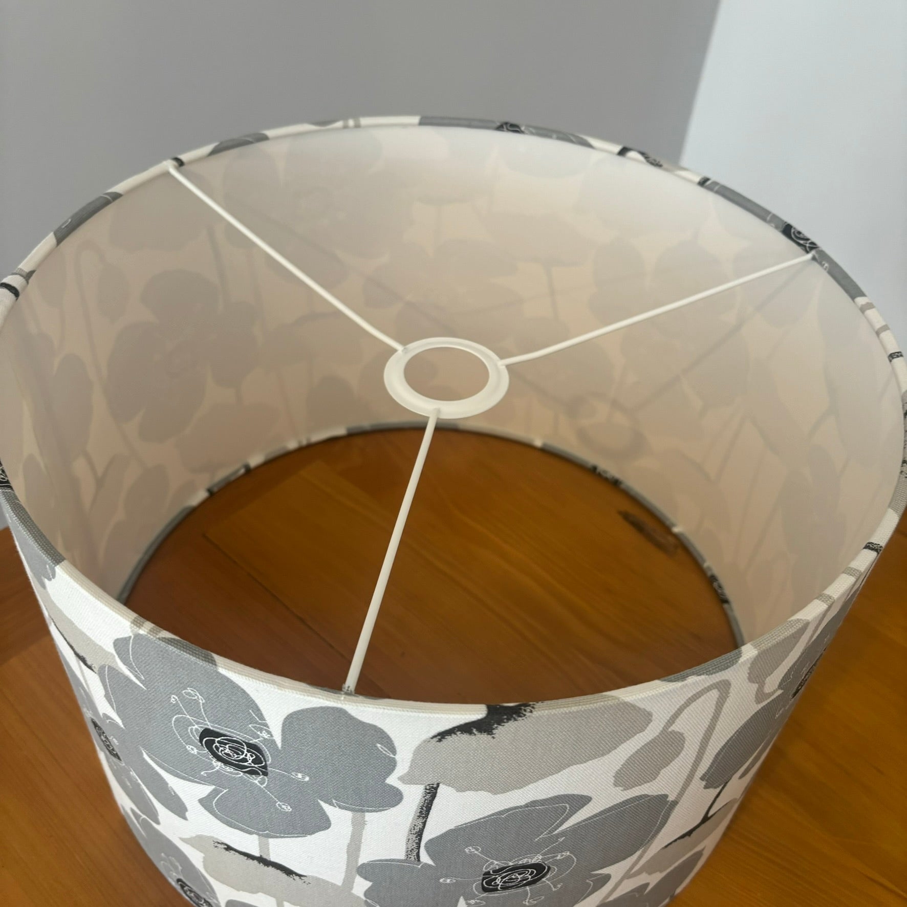 Lampshade made in a floral motif fabric in grey, beige and cream. It is a rolled edge drum style lampshade. Can be used on a table, floor or as a pendant light.