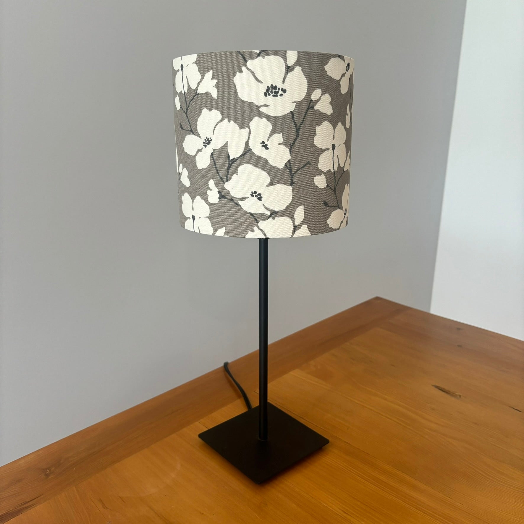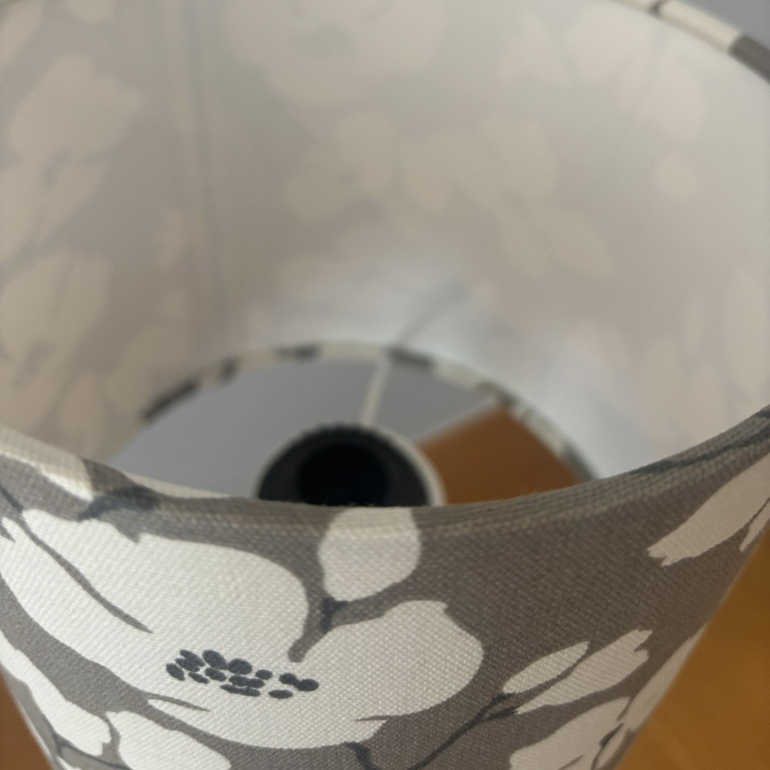 Lampshade made in a floral motif fabric in cream and taupe. It is a rolled edge drum style lampshade. Can be used on a table, floor or as a pendant light.