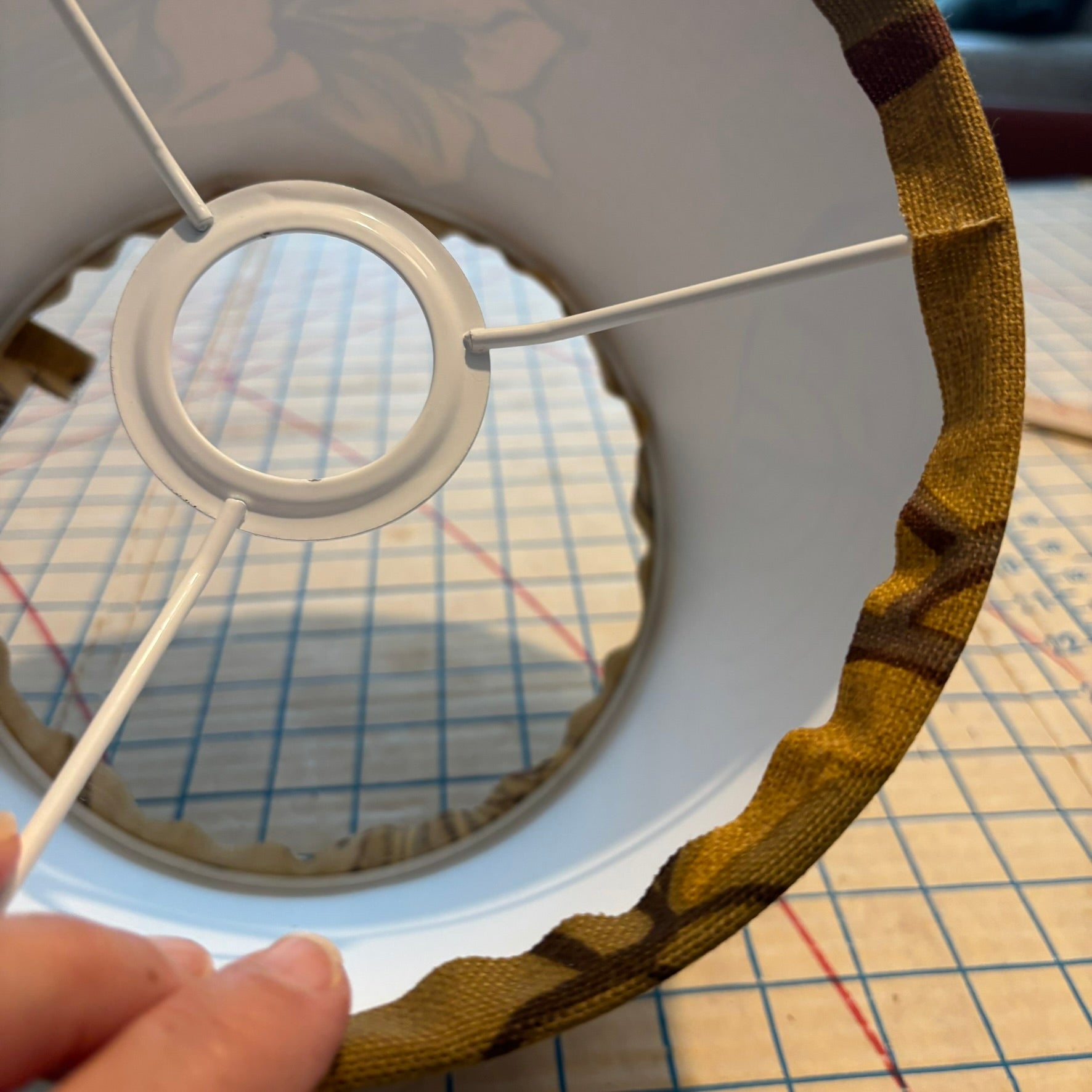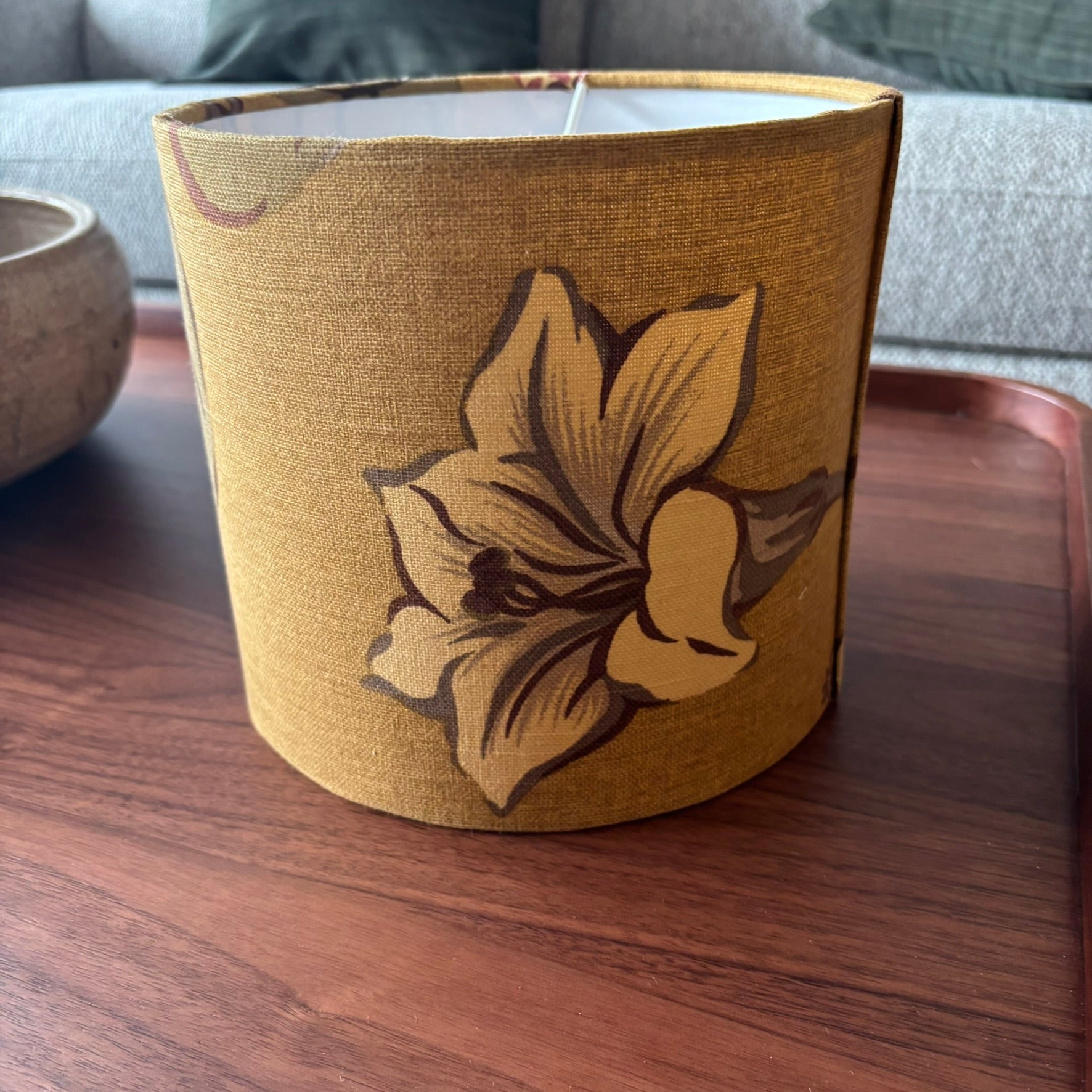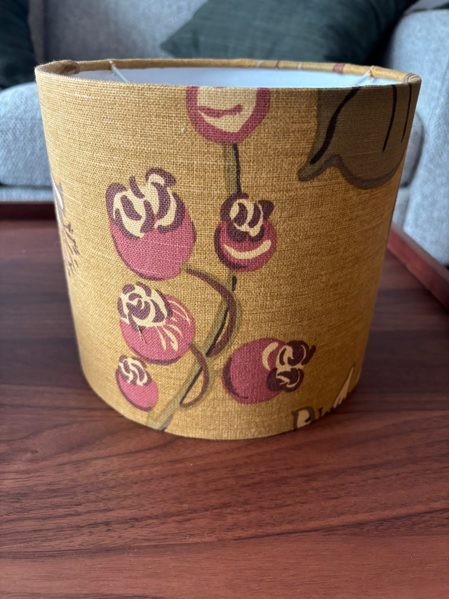 Lampshade made from vintage gold floral toile fabric with butter yellow and cranberry flowers. This fabric is part of a vintage collection. It was sourced from an annual fabric resale event in Ottawa. It caught my eye as soon as I saw it.